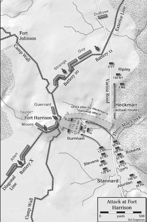 Ord verbally instructed the commander of one division, the skilled George Stannard, to attack Fort Harrison. The other division, under the unexperienced Charles Heckman, was to attack on Stannard’s right. Stannard’s 2,800 men quickly overwhelmed the 200 Confederate defenders, but with a loss of about 500 men. All three brigade commanders went down: Hiram Burnham was killed, Aaron Stevens was wounded, and Samuel Roberts succumbed to his illness. Heckman apparently was unclear about his orders. He indeed attacked on Stannard’s right, but was hundreds of yards off target. He took a few redoubts, but did not pierce the main enemy line. Instead of having both divisions at Fort Harrison, behind the Confederate wall and ready to move north, Ord had only half of his men in position.