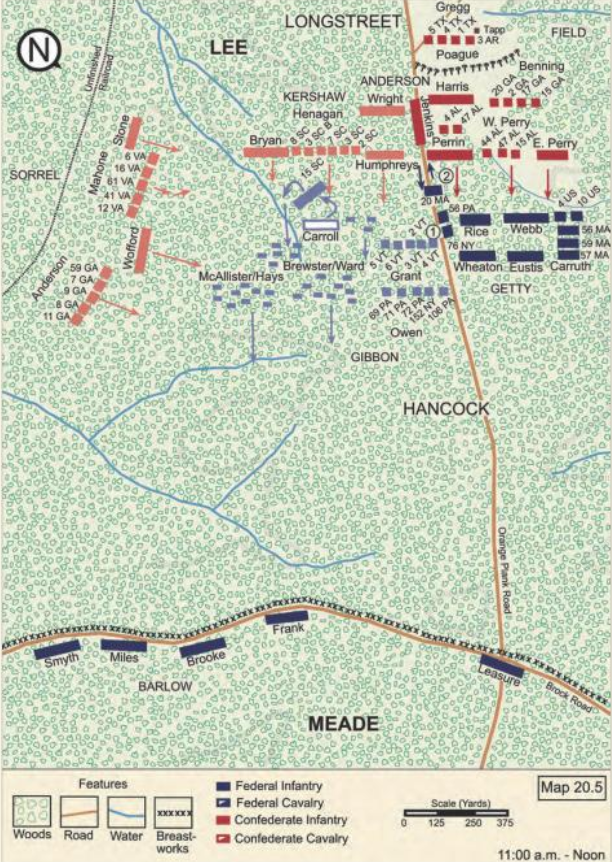 The Confederate fire proved too much, and the 56th Massachusetts fell back in confusion towards the famed Plank Road-Brock Road Intersection. There were Second and Ninth Corps units all jumbled together from the day’s confused fighting, but those soldiers banded together to pitch in and try and repel Longstreet’s advance.