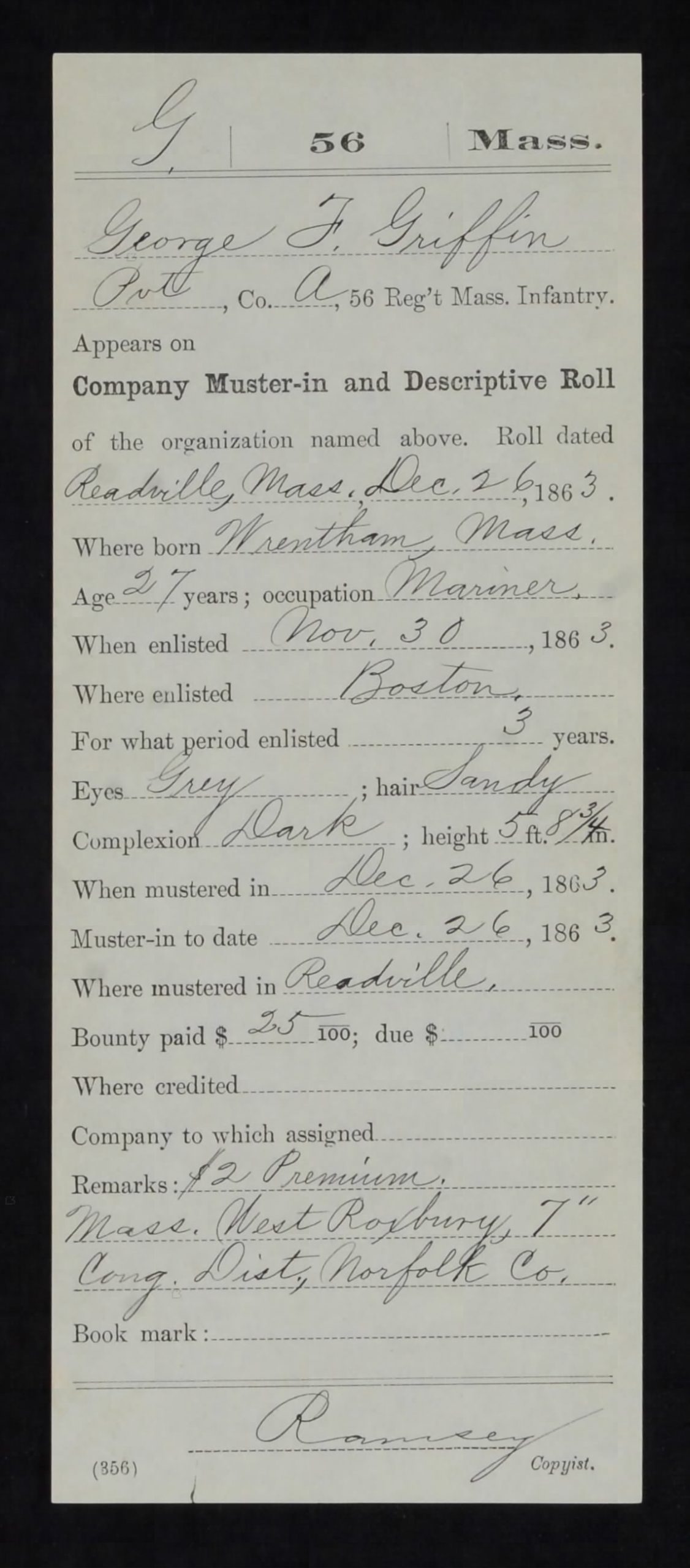 George and another of his brothers, Thaddeus, took their opportunity to join the Union war effort in December, 1863. The duo ended up enlisting in Company A, 56th Massachusetts Infantry. They both received a $25 bounty for their enlistments. George was twenty-five, and his muster record notes he had gray eyes, sandy hair, a dark complexion, and stood 5’8”.[5]