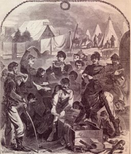 Santa, as we know him, is a creation of artist Thomas Nast who created the bearded old elf for the 1862-63 Christmas edition of Harper’s Weekly. In his famous drawing, he showed Union soldiers opening their Christmas boxes from home. One soldier gets a stuffed stocking (hopefully the other one was in there somewhere!), and another got a fancy new pipe. Santa is handing out toys, including a Jeff Davis puppet, and many soldiers hold their gift boxes close to their hearts. Winslow Homer showed soldiers on Christmas Day in 1861, and everywhere are boxes from home. They were packed with more love than sense if letters home are any indication. Spoiled food or broken glass was a common complaint, and once in a while, the bottle holding the traditional Christmas cordial arrived empty. For the most part, soldiers loved getting a box from home, no matter what the season.