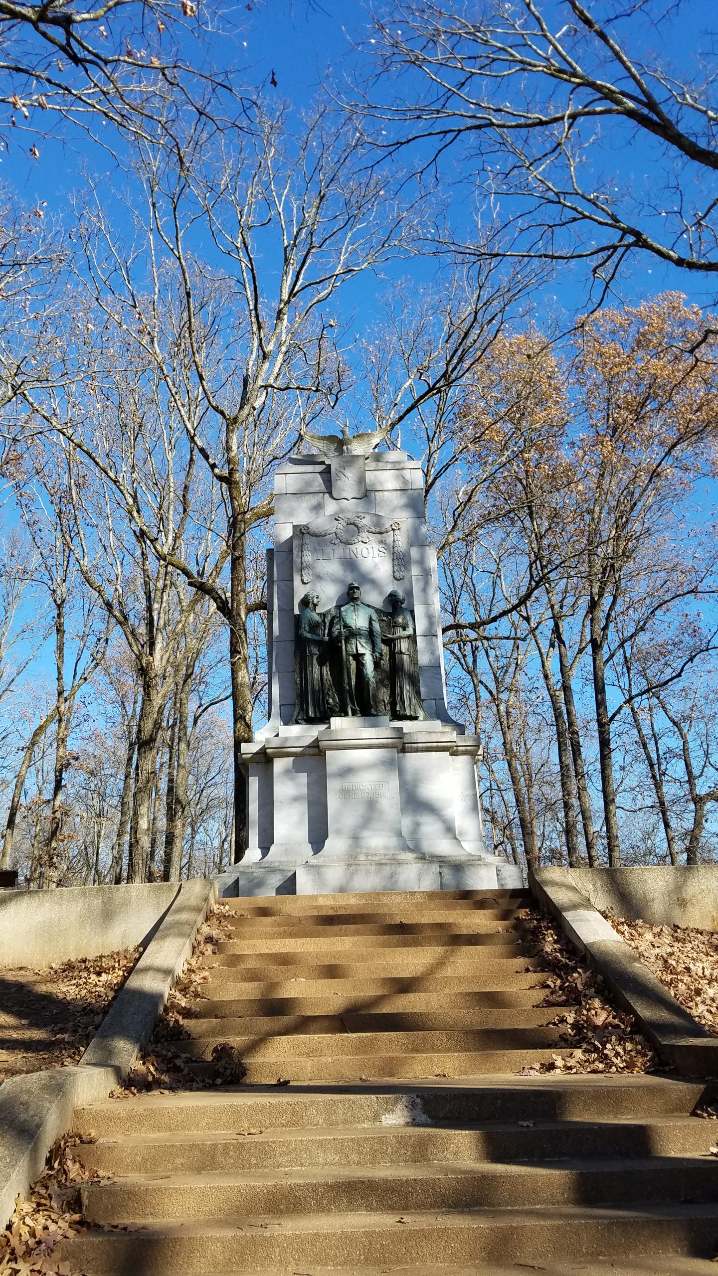 A) Park in the lot at Cheatham Hill Road, carefully cross the modern road and follow the trail straight ahead into “Activity Area #3” on the park maps. Descend the gentle sloping hill which had been soaked at the time of the battle and turned into a natural “slip’n’slide” for Union troops attack over this ground. Enter the woods and continue following the trail. You’ll cross the creek on bridges that weren’t there during the battle and Cheatham Hill rises in front with the Illinois Monument at the top. As you ascend the hill, notice how the ground rolls. Pinned down by Confederate fire from the top, Union wounded and combatants sought shelter in these ground depressions.