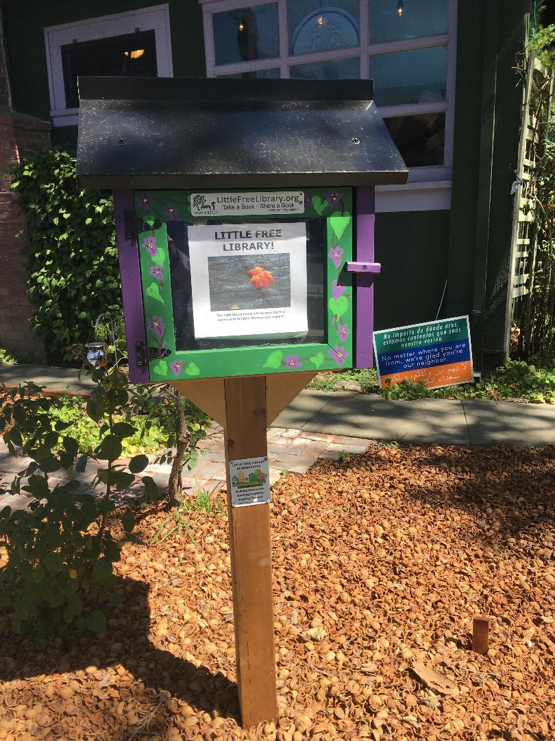 I wanted one for a long time and finally received one for Christmas, albeit six months early. I carefully painted it to match the house, even adding violets around the edges. A hole was dug, cement poured, a post installed, and, finally, the box was up. Now to fill it with beautiful books to share with my neighbors and their families. AH! But there was/is a problem…the books.