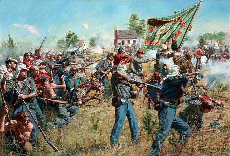Additionally, there are several paintings of the Fire Zouaves during the Battle of First Bull Run. I have included two. One shows those “bespangled sons of Mars” defending Griffin’s Battery on Henry House Hill (above); the other shows “Stormin’ Jack” Wildey helping the gallant 69th regain their glorious green flag (below). Both show members of the 11th wearing havelocks.