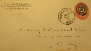 Via eBay I obtained a circa 1894 envelope sent from “Brady & Maltby,” a Buffalo, New York company where at the time Franklin Churchill worked as a bookkeeper. The envelope was a common one with a common stamp but the seller claimed that the postmark was perfectly centered and wouldn’t move much on price, but for all that, I paid up for the envelope due to its clearly written address.