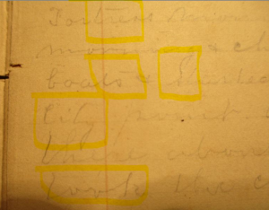 The diary, written in pencil, speaks of the weather, apples, religious services, sick days, and keeps track of letters sent and letters received. When he mentions relatives or friends, and, what I believe are mentions of letters from his future wife, it’s often with initials. And the prison guard sparingly mentions “Rebs.”
