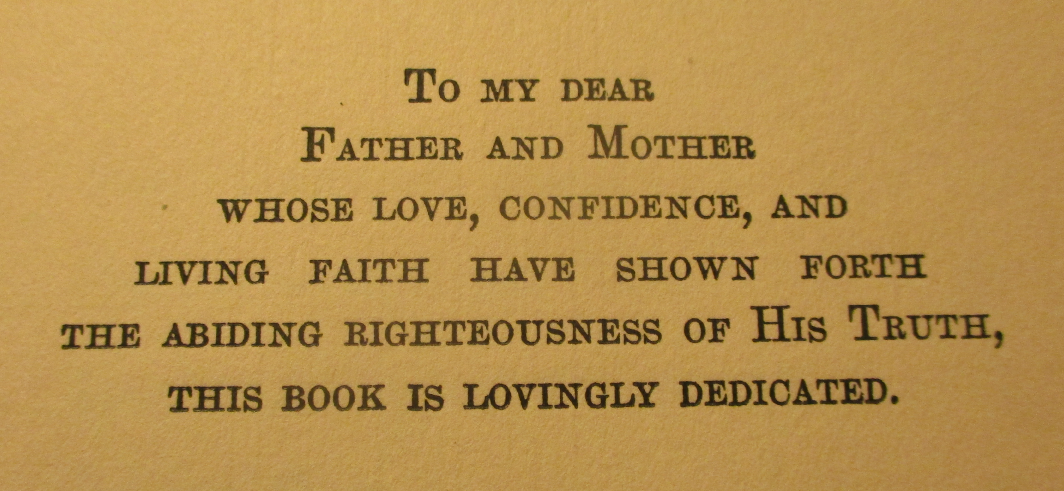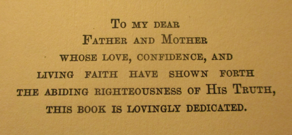 Online, I bought the book, Spirit Power, published in 1922, written by May Thirza Churchill, one of Franklin and Celia Churchill’s three daughters. In it, I found a beautiful, loving dedication to her parents, which I am including to show the kind of person, and parent, Franklin Churchill grew to be.