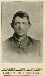 John Robert Rankin was born to Melissa and Orville Rankins (the name may have changed at some point, or is at least misspelled in period documents) in Greencastle, Putnam County, Indiana on January 20, 1843.[2] By virtue of his father’s position as a founder of DePauw University along with an aptitude for learning, John was able to secure a position with the local printing office. By 1860 the 17-year-old Rankin was listed as a printer in the census, a profession requiring skill and offering some respect.[3] In 1861, he enlisted in the 27th Indiana Infantry.[4] His obituary recorded that an act of valor at Antietam earned him a promotion to sergeant, mentioning that he was “the only surviving member of his company after the famous charge across the cornfield.” [5]  However, his postwar writings about the battle focus more on his fear than on any act of heroism on his part.