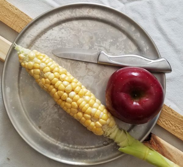 Today, I find out that I bought sweet corn at market. So sweet that it should be called “candy corn.” It’s delicious, but I really don’t think it’s an authentic flavor. The apple is a Rome variety…not quite sure if that is a historic type, but the orchard where I picked has been there since the early 20th Century. I’m thankful for the slight tartness of the apple to balance the over-sweetness of the corn.