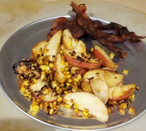 I like the concept of fried corn and apples, but if I make it again I’ll probably “go modern” and add a little onion, some herbs, and fry it lightly in some olive oil. It would be a good camping dinner.