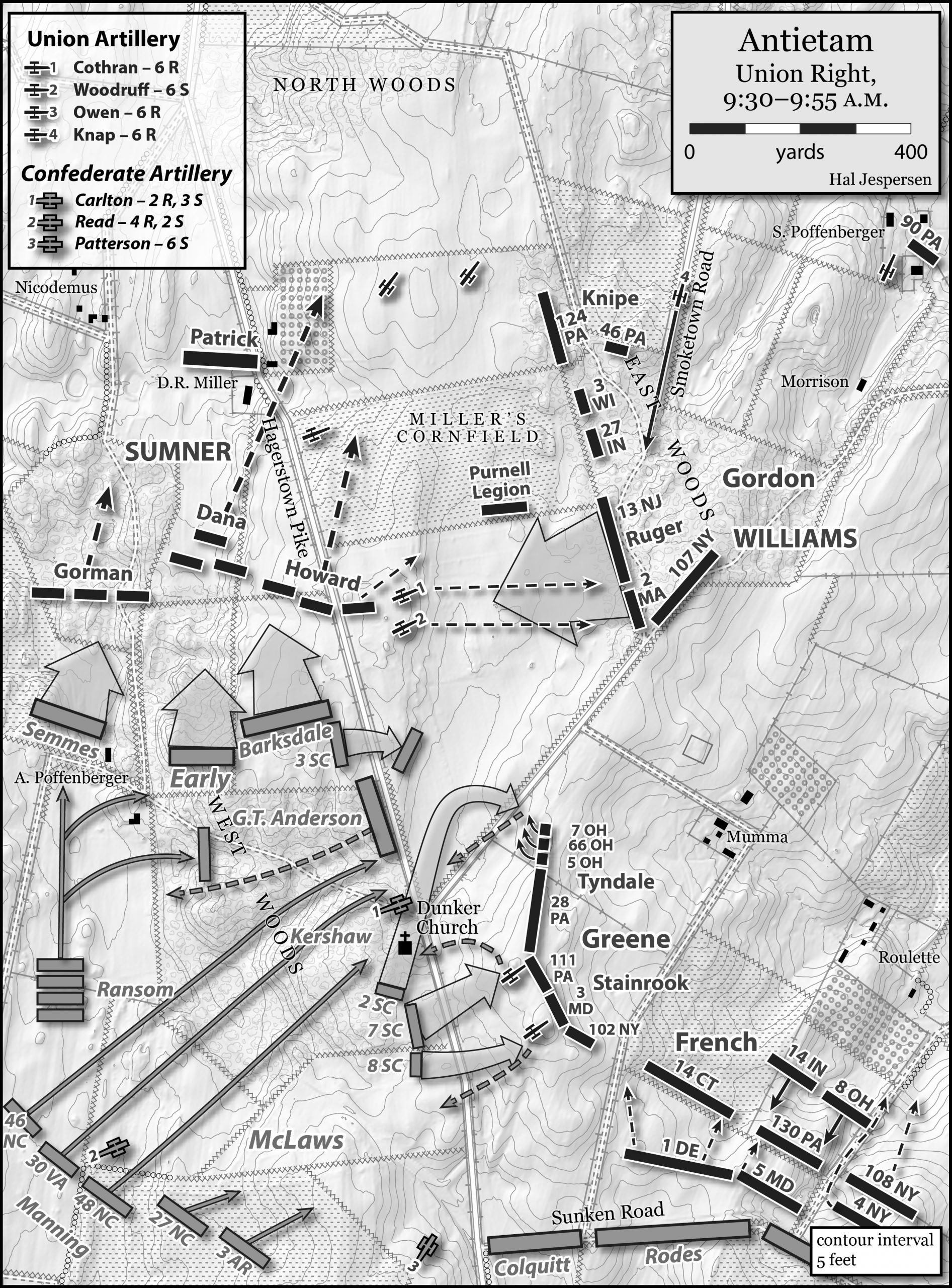 After roughly three hours of battle, the Confederate left faced imminent collapse. Three divisions under Maj. Gen. Thomas “Stonewall” Jackson had fought themselves out against the Union I Corps, with only one fresh Confederate brigade in reserve. Three brigades of Maj. Gen. D. H. Hill’s division shifted left from the Confederate center. The small Union XII Corps fought and soundly defeated these brigades. In doing so, it permanently cleared the East Woods and the Miller Cornfield. Two brigades of Brig. Gen. George Sears Greene’s division then created a lodgment, temporarily without ammunition, on the ridge east of the West Woods and the Dunker Church. Meanwhile, a green regiment from Brig. Gen. Samuel Wylie Crawford’s brigade, the 125th Pennsylvania, advanced without support into the West Woods and just beyond the Dunker Church. Other Federal units from the morning’s fighting were scattered around the edges of the West Woods. Most soon cleared the way for a fresh veteran Federal division that drove west across the Hagerstown Turnpike and into the West Woods, which until moments before held little more than a single Confederate brigade.[1]