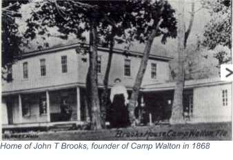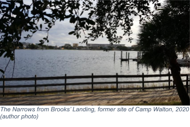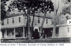 However, this is not the end of the story for Camp Walton. In 1868, a former member of the Walton Guards, John Thomas Brooks, returned to The Narrows with his young wife and homesteaded the very area he had helped defend in the spring of 1862. Eventually, Camp Walton grew into a modest community that played host to travelers from all over. Hotels were built along the waterfront, including near the spot where the Walton Guards were set up. Hotel proprietors rented out boats to their guests to cross The Narrows to Santa Rosa Island. The area that endured Captain Henry Closson’s bombardment was made into Brooks’ Landing, a small park known for its local events.