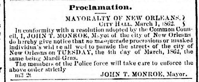 By Mardi Gras 1862 things were different. In January and February, papers were choked with masquerade ball advertisements and guarantees that the Mystick Krewe of Comus would do “something to astonish the town.” This was not to be. Word arrived of Confederate battlefield setbacks and nine of the city’s regiments were dispatched north, later participating in the Battle of Shiloh. Concurrently, David Farragut’s naval squadron ascended the Mississippi River to assault New Orleans itself. Martial law was declared, local militia mobilized, and in consequence, Mayor John T. Monroe issued a directive cancelling all Mardi Gras festivities, proclaiming that “no masquerade procession or masked individuals will be allowed to parade the streets of the city of New Orleans on TUESDAY, the 4th day of March, 1862, the same being Mardi-Gras;” instead, the day after the cancelled festivities saw a full brigade of militia parading through the streets.[3]