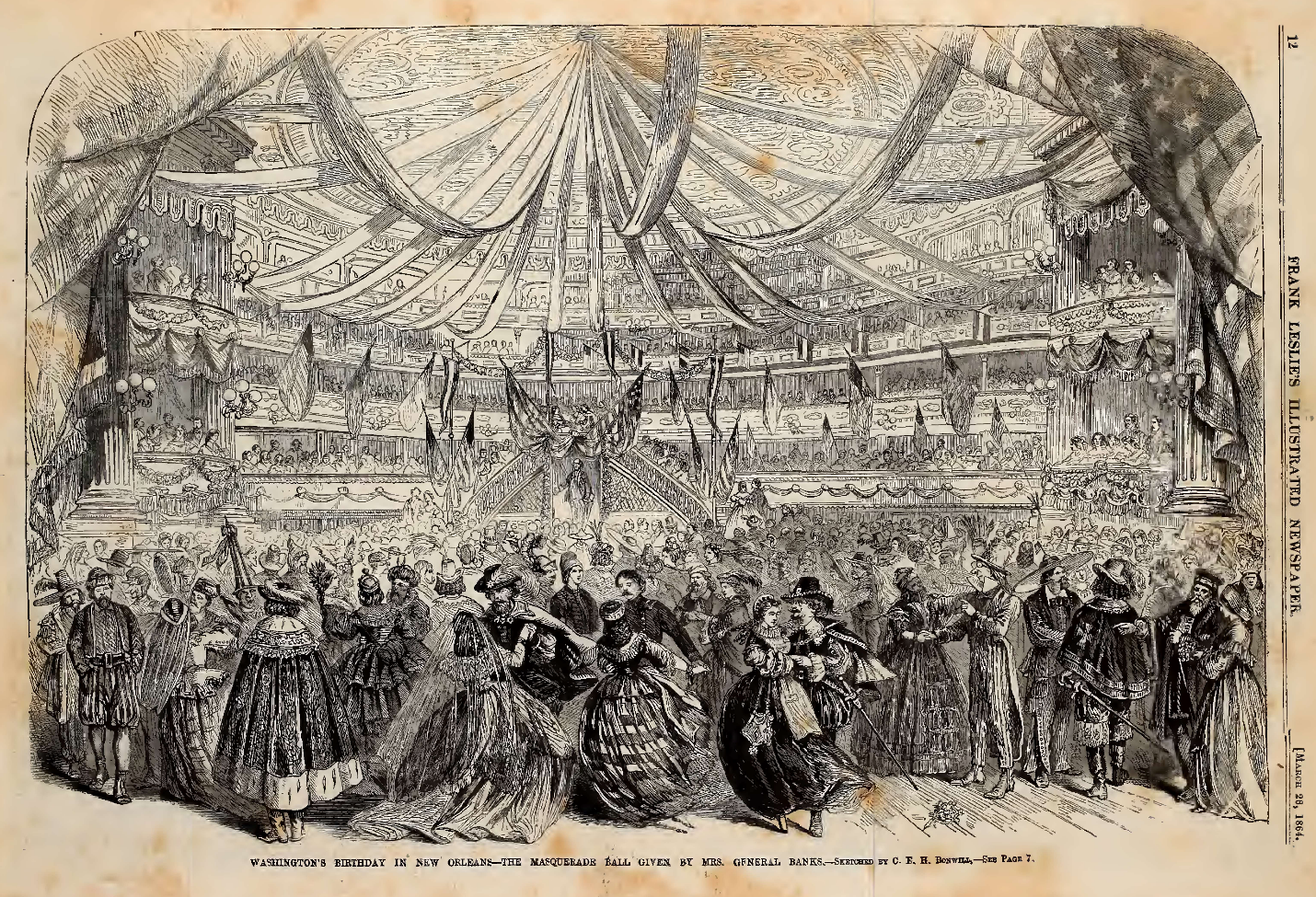 [7] Extract from Sam’s Letter, February 15, 1864, in John M. Stanyan, A History of the Eighth Regiment of New Hampshire Volunteers (Concord, NH: Ira C. Evans, 1892), 355; “The Masquerade Ball Given by Mrs. Gen. Banks,” Frank Leslie’s Illustrated Newspaper, March 26, 1864; Dispatch of Acting Consul Charles Fauconnet, March 11, 1864, in Carl A Brasseauz and Katherine Carmines Mooney, ed., Ruined by this Miserable War: The Dispatches of Charles Prosper Fauconnet, a French Diplomat in New Orleans, 1863-1868 (Knoxville, TN: The University of Tennessee Press, 2012), 102.