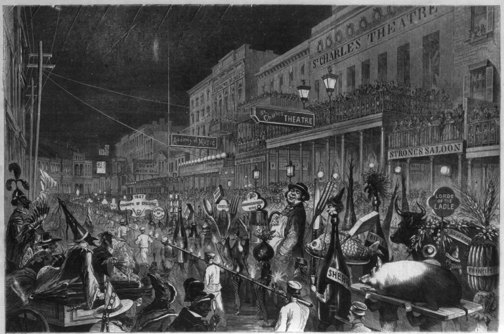 1864 found a renewed Mardi Gras spirit embracing New Orleans. Occupiers relaxed rules and by midday on February 9, 1864, “considerable numbers, attired in every description of costume, in carriages and on foot, began roaming the streets” and an impromptu parade formed as men, “mounted on horses, asses, and mules” pulled carts “piled to the number of fifteen or twenty” down Canal Street. This improvised parade included “King and Queen, Princess, peasants, Satan and fair ladies, beggars and heiresses, clowns, nymphs, Friars, savages, dancing girls, sailors, soldiers, negroes, mulattos, Creoles, octoroons … all with one object in view, pure unalloyed, boisterous fun.”[5]