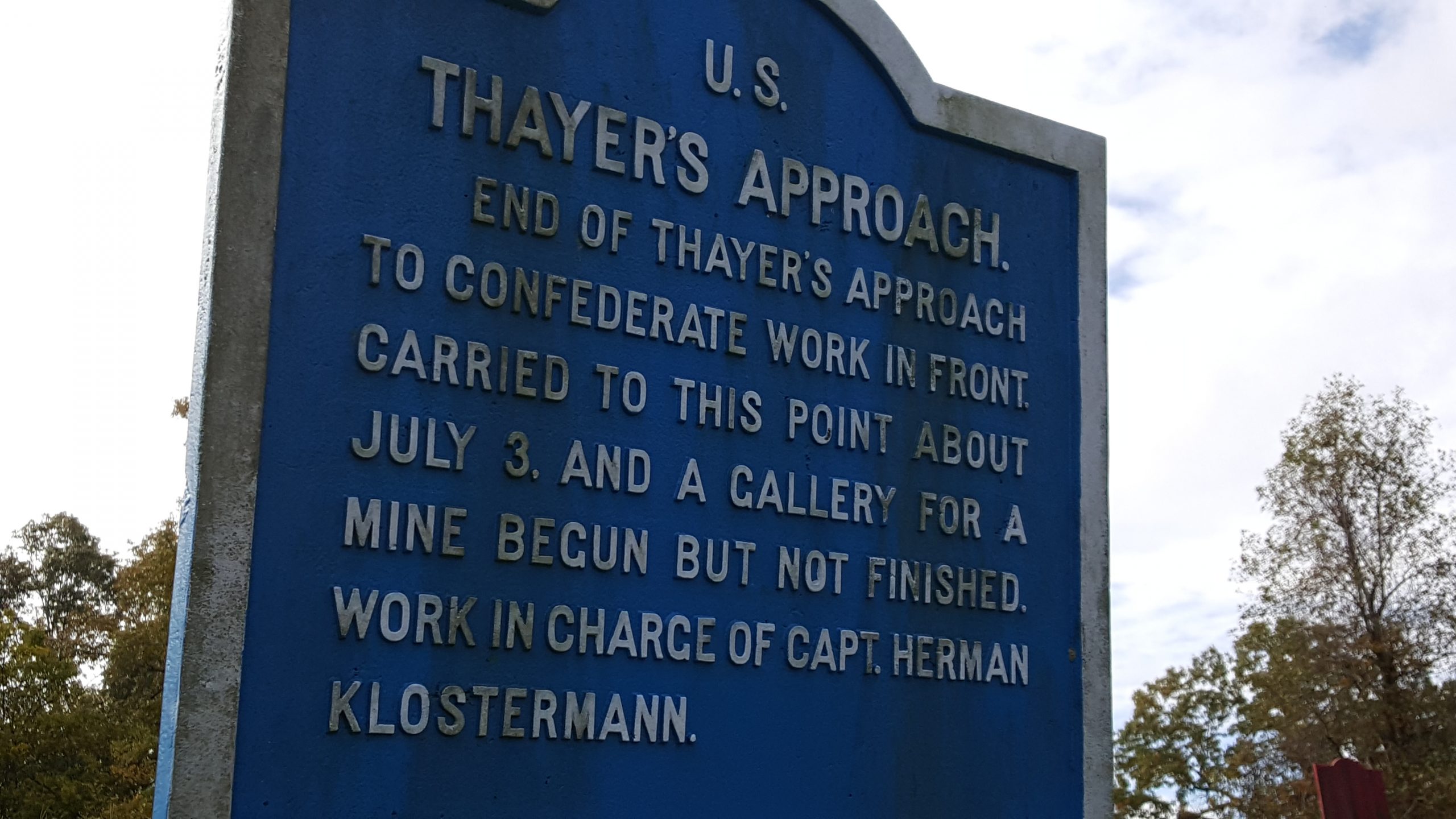 However, due to the unstable terrain that the Vicksburg battlefield is infamous for, North Union Avenue was closed to cars and pedestrians. Thayer’ Approach landed smack-dab in the middle of North Union Avenue, so we settled for getting a view from the Confederate side. Several blue signs dotted the slope leading down to North Union Avenue and Tour Stop #6, but I could read none of them from the safety of the parking area. I hoped that perhaps one of these signs would be a marker for the 9th Iowa Infantry and I could stand where Ackerman might have been. I carefully trekked my way to each sign, finding no trace of the 9th Iowa. I did, however, reach the high watermark of the Union’s advance to the Confederate line.