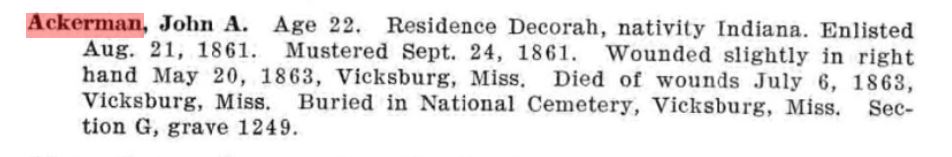 Searching through the muster rolls, I decided upon Private John A. Ackerman of the 9th Iowa Infantry, Company H. His story stood out even more, as his service record reads, “Wounded slightly in right hand May 20, 1863, Vicksburg, Miss. Died of wounds July 6, 1863.” [1] Ackerman suffered a slight wound sometime between the two assaults in May, and then later died of said wounds. It’s not all too surprising, considering the high mortality rate for soldiers whose wounds had become infected. Did Ackerman not receive adequate medical treatment? Or did he try to keep the wound clean, but such a task was nearly impossible when he might have been part of the digging crew for the trenches leading to the Confederate line? Either way, Ackerman was buried in the Vicksburg National Military Cemetery. [2]
