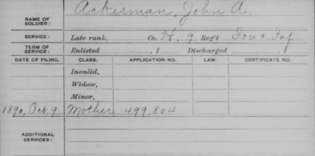 [8] Organization Index to Pension Files of Veterans Who Served Between 1861 and 1900, compiled 1949 – 1949, documenting the period 1861 – 1942, Roll T289, Catalog ID 25