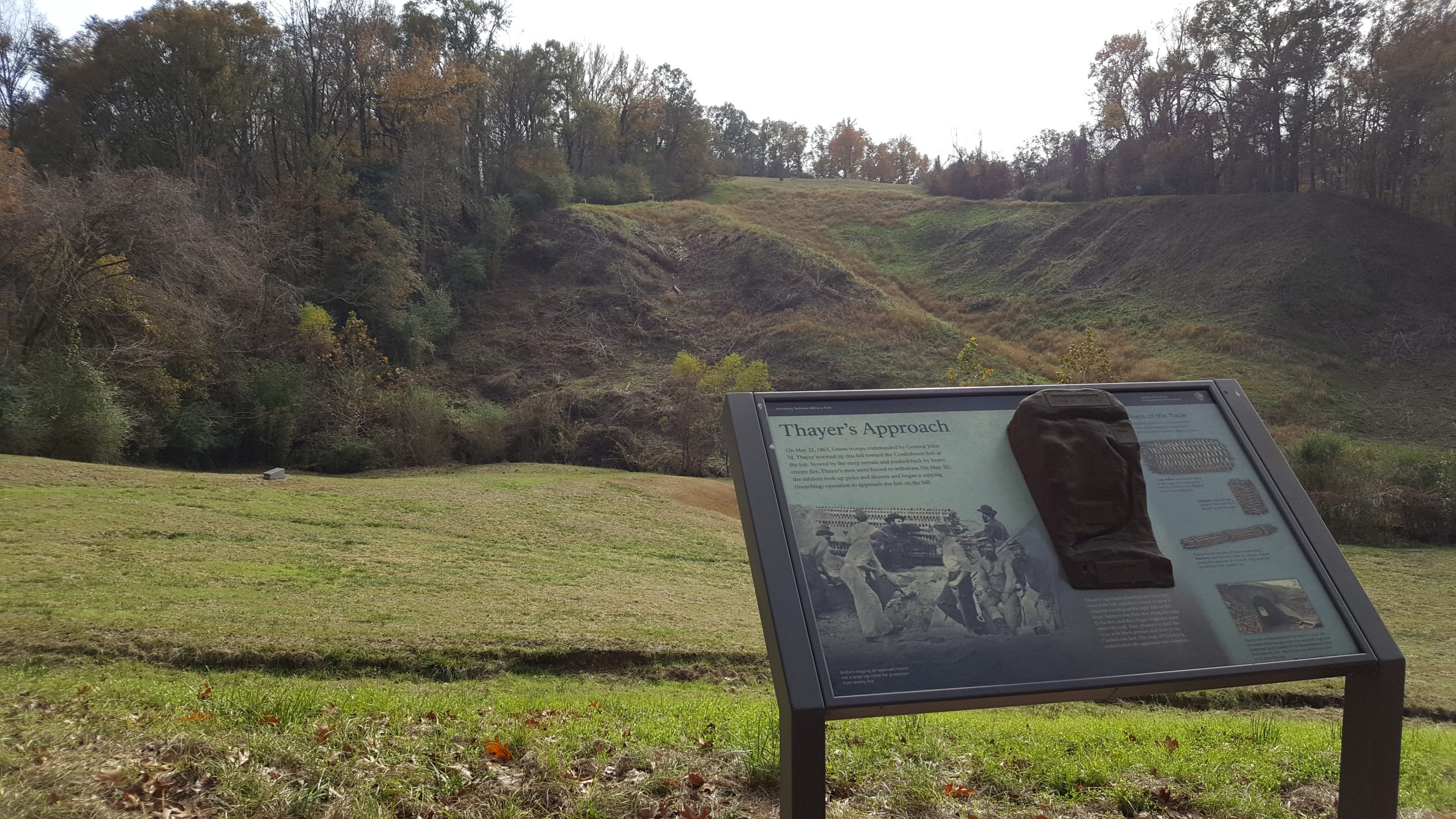 A couple of years ago, I wanted to write a flash-fiction story about visiting a battlefield and seeing a “ghost.” Forgive my ignorance and wild imagination. I had just begun studying the Civil War and the fanciful idea wouldn’t leave me alone until I wrote it down. We had recently visited Vicksburg and walked the entirety of the park in two days, which allowed me to appreciate the hilly terrain and explore the tour stops more deeply than we might have if we were driving. I was drawn to Thayer’s Approach where Brigadier General John M. Thayer led his men in two unsuccessful assaults against the Confederate line on May 19th and May 22nd, 1863. Afterward, they excavated a tunnel in the ridgeline, both for protection and in order to carve out a safe approach to the enemy so as to dig a mine and blow it up, as what happened at the Third Louisiana Redan. I could imagine the boys in blue digging night and day, working in teams to cut through the landscape. So, I decided to write about a soldier who was stationed along that portion of the Union line and had died in Vicksburg.