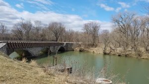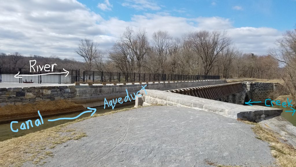 There’s the Potomac River. Parallel to the river is the C&O Canal. Then, there’s the Conococheague Creek which joins the river perpendicularly. To cross the Conococheague Creek, the C&O Canal flows through an aqueduct.
