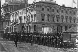 Just that day, Russell had witnessed an assemblage of men “doing a goose-step [and marching] forth dressed in blue tunics and gray trousers, shakoes and cross-belts, armed with musket and bayonet, cheering and hurrahing in the square before the War Department, who were, I am told, the District of Columbia volunteers and militia.”