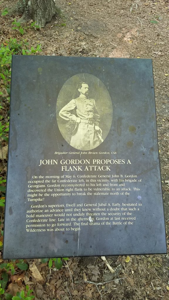 Gordon was very busy during the Battle of the Wilderness – he started the battle on the south side of the turnpike on May 5th when his brigade repulsed the initial attack by brigades of the Union’s V corps. That evening his brigade was re-deployed across the turnpike to the extreme northern flank of the Confederate line in preparation for his attack on the Union right.