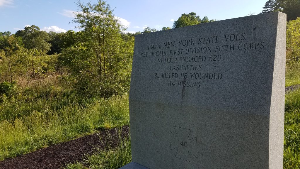 The monument for the 140th New York State Volunteers is near the trail in Saunders’ Field sloping toward the western tree line.