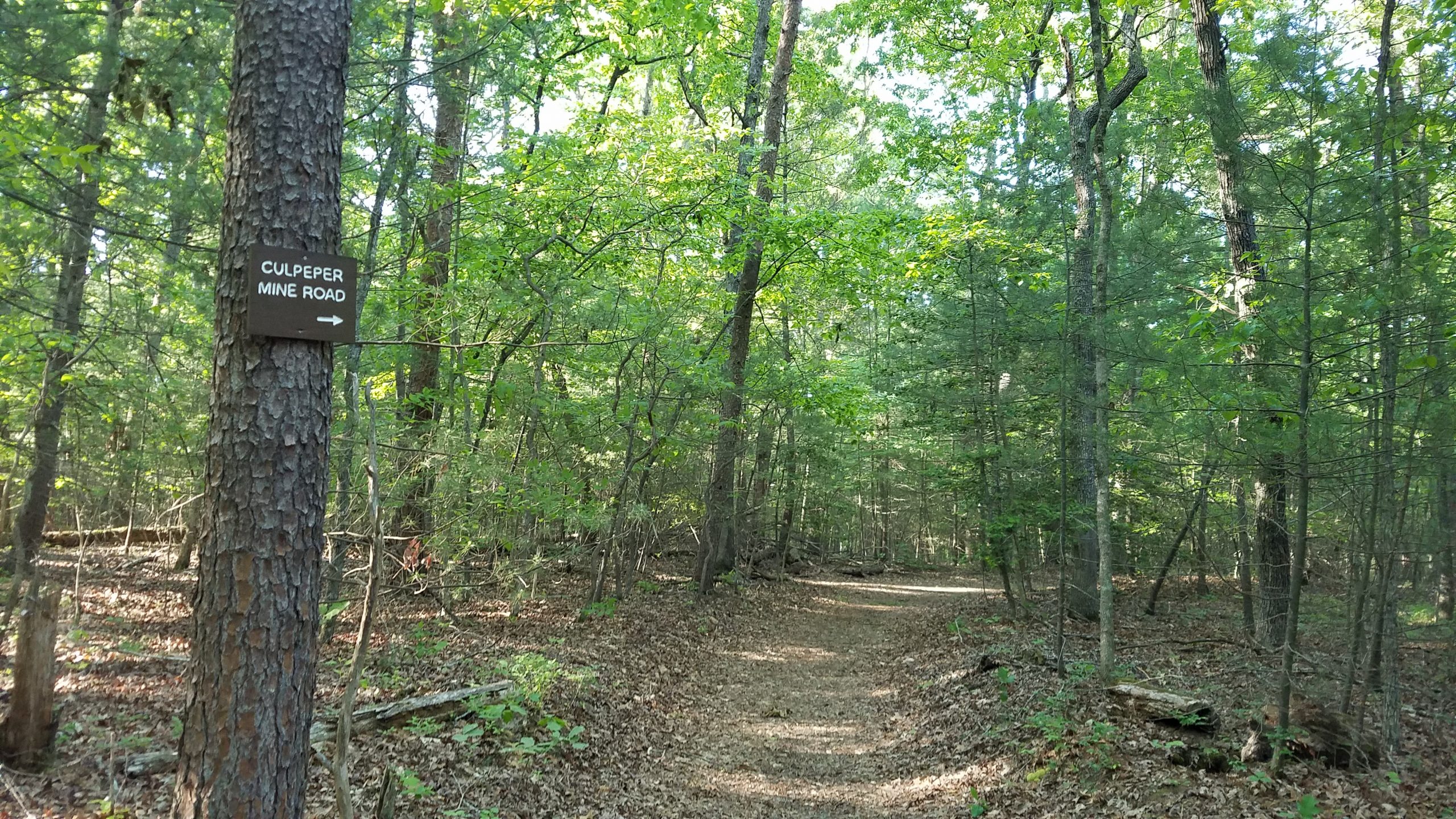 Here’s part of the old trace for the Culpeper Mine Road. The trail signs are clear at this point where the trail and old road meet. Just follow the blue blazes and trail signs!
