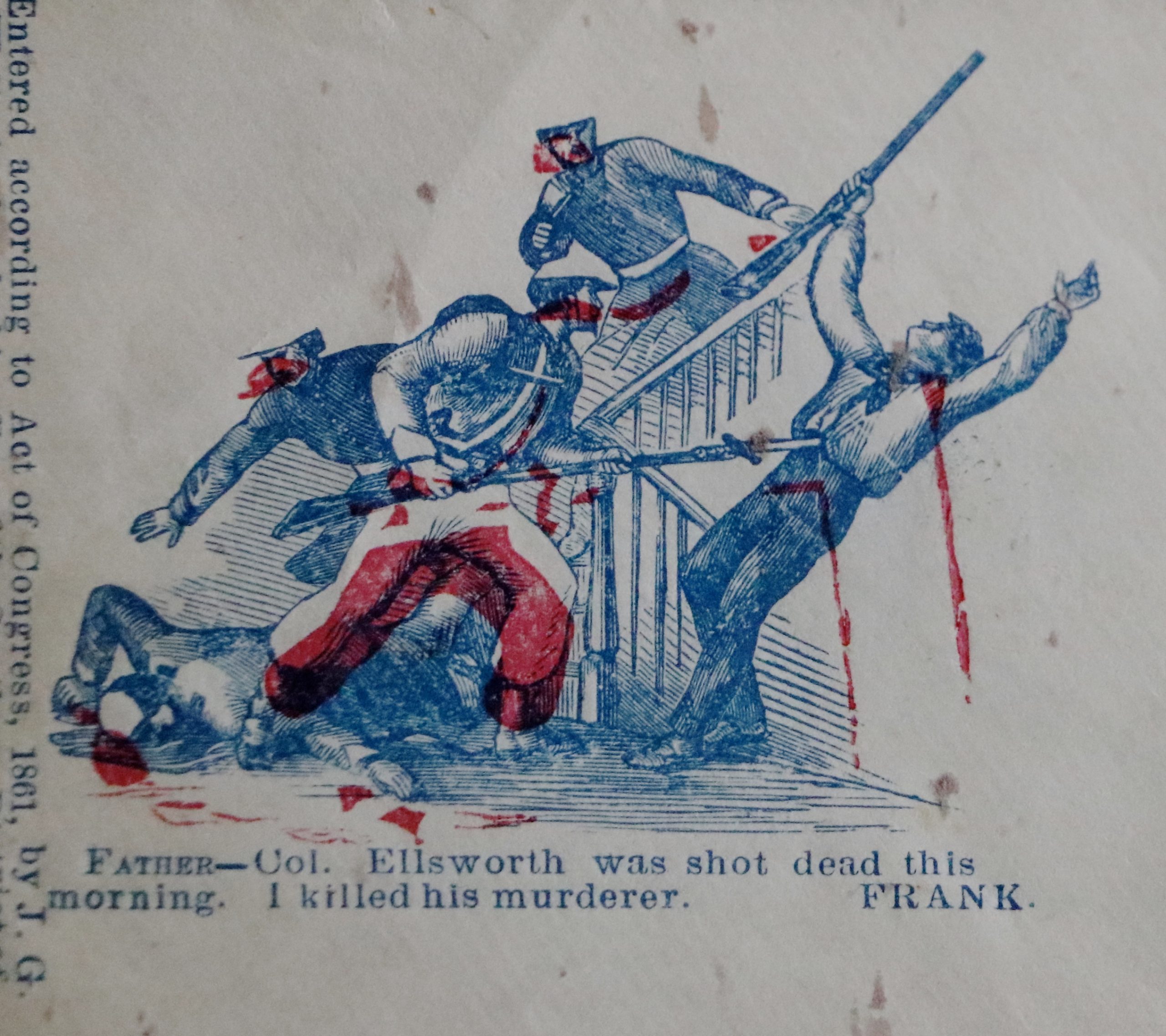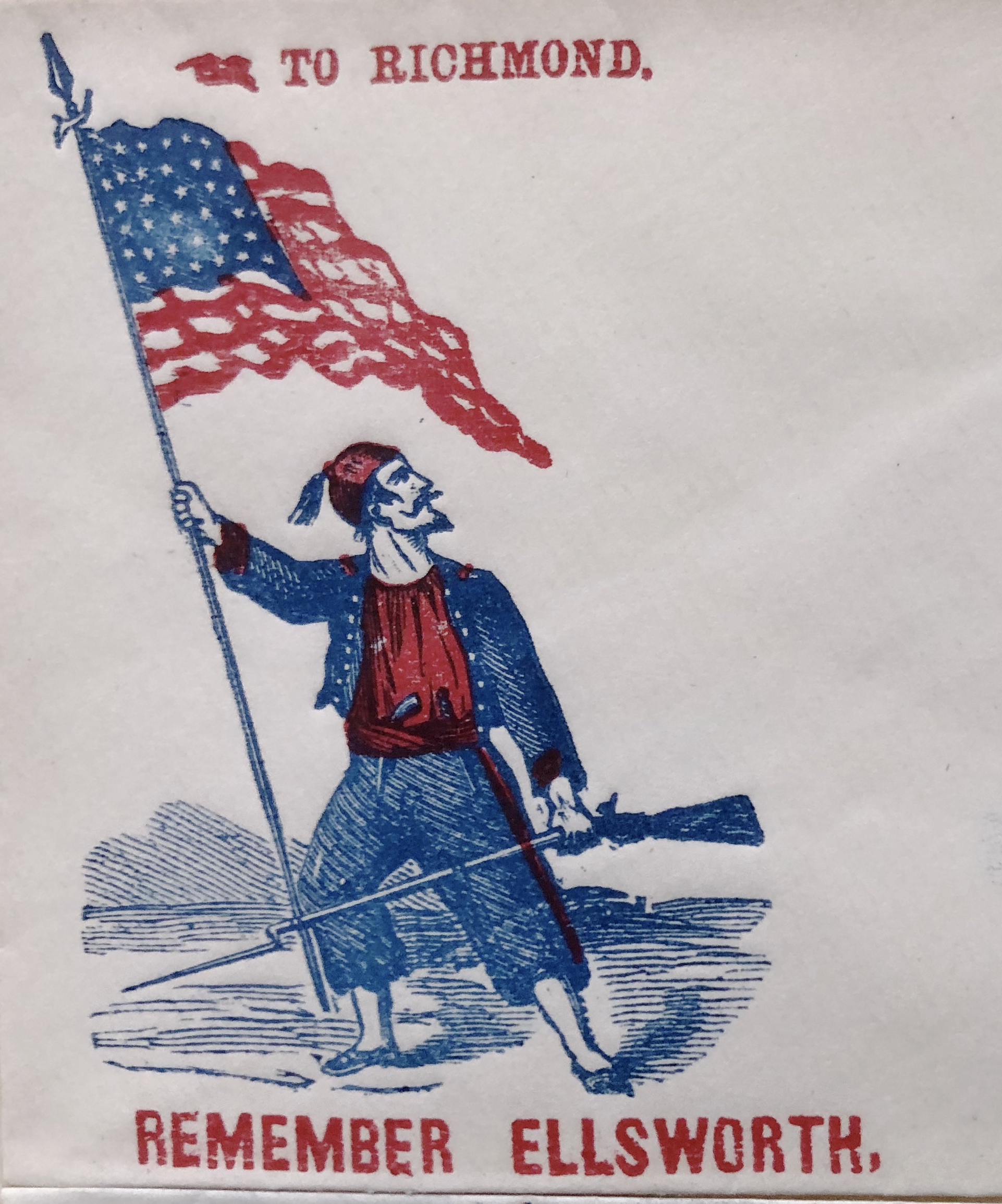 The ECW editors decided Meg would “never forgive us” if we let this anniversary slip by without a mention, especially since it is the 160th anniversary of this tragedy which cut short this first Union officer’s life. Working with Leon Reed and his fine collection, we’ve prepared a selection of envelope artwork from the Civil War era—visual tributes for the life and sacrifice of Colonel Ellsworth.