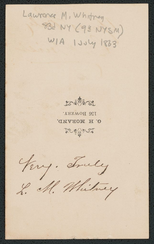 His name was Lawrence M. Whitney, and he had promoted to lieutenant in Company E in the 83rd New York Regiment. He was wounded during the Battle of Gettysburg.