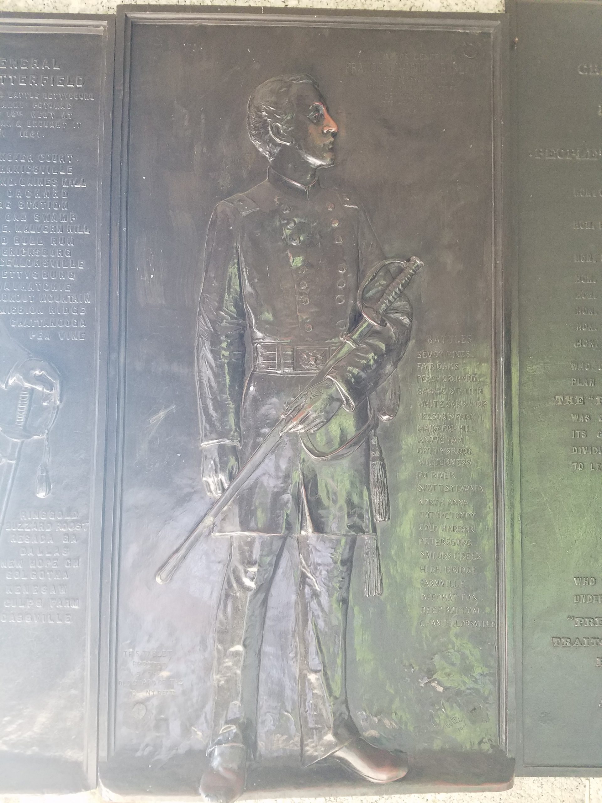 Turning around, two figures in relief art caught my eye. One looked vaguely familiar from Overland Campaign photographs. Wait…what…why? That’s General Francis C. Barlow. With the 44th New York of the V Corps?