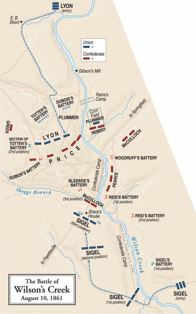 Lyon’s army soon occupied strategic Springfield and was threatened by a Southern coalition of McCullough’s Confederate Army, comprised of Louisiana and Texas units, Pearce’s army of southwest Arkansas, and the MSG. This force outnumbered Lyon’s army 2 to 1.