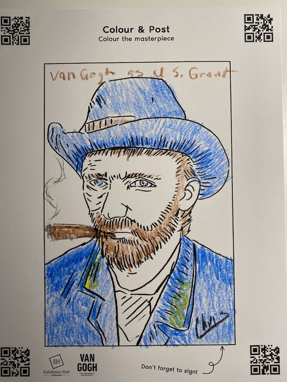 At the end, visitors were invited to take up crayons and create their own Van Gogh-inspired works based on some of his paintings. In essence, they provided black-and-white sketches of some of Van Gogh’s works, and we could color them in. Jenny chose a street scene while I chose one of Van Gogh’s 1887 self portraits, “Self-Portrait in Gray Felt Hat.”