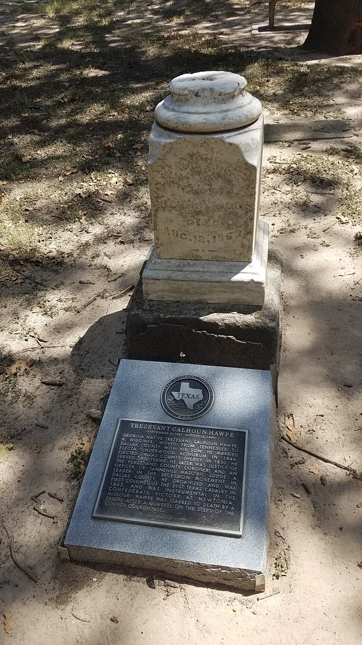 Georgia native Trezevant Calhoun Hawpe, a widower, moved from Tennessee to Dallas County with his son. He married Electa Underwood Bethurum, in 1848. Elected Dallas County Sheriff in 1850, he served two terms. He later was Justice of the Peace and County Coroner, and an officer of the Tannehill Masonic Lodge. A leader in the secession movement in Dallas County, he organized an was first colonel of the 31st Texas Cavalry in 1862, and was instrumental in the Confederate victory at Newtonia, Missouri. Hawpe was stabbed to death by a friend after a quarrel on the steps of the county courthouse.