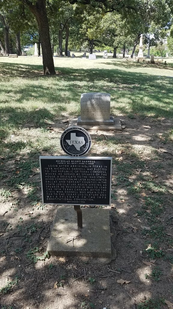 Soon after arriving in Texas in 1838, Nicholas Darnell was elected to the Republic of Texas Congress, where he served as speaker of the house. A delegate to the 1845 statehood convention, he later represented Dallas and Tarrant Counties in the state legislature, again serving as speaker. He resigned in 1863 to lead the 18th Texas Cavalry. After the Civil War, Darnell was again elected to the Texas Legislature and was a delegate to the 1875 Constitutional Convention.