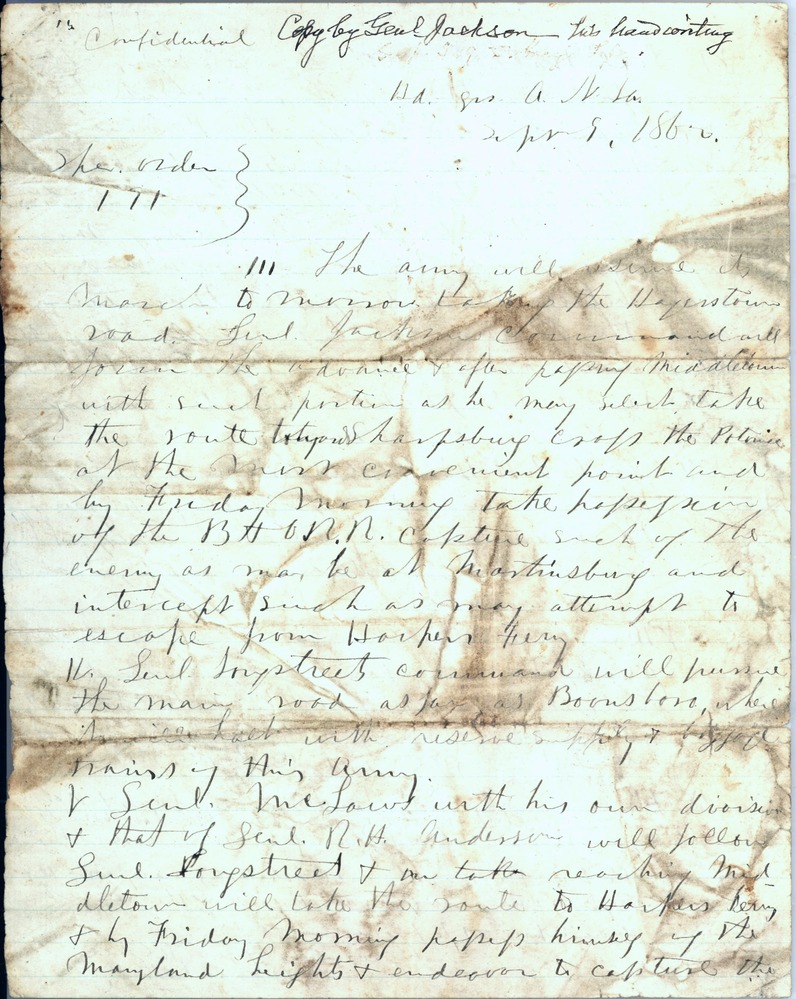 What are “the 3 other extant copies?” There are actually in existence five “extant copies:” (1) Special Order 191 signed by Chilton and sent to Cooper. It has two paragraphs; (2) Special Order 190, eight paragraphs, written in the hand of an unidentified clerk and sent by Lee to Davis on September `12, 1862; (3) Special Order 191, ten paragraphs, written by A.P. Mason into Chilton’s letter book; (4) Special Order 191, eight paragraphs, written in the hand of Stonewall Jackson; (5) Special Order 191, eight paragraphs, copied by an unknown hand from Jackson’s copy and addressed “for D.H. Hill.” The Lost Order is indeed a “unique” document as it is the only one of the five addressed to D.H. Hill.