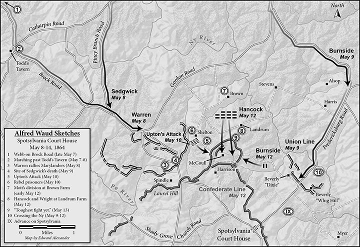 Waud’ work places him on the western front of the battlefield through May 10, and then he’s near the middle of the battlefield by May 12.