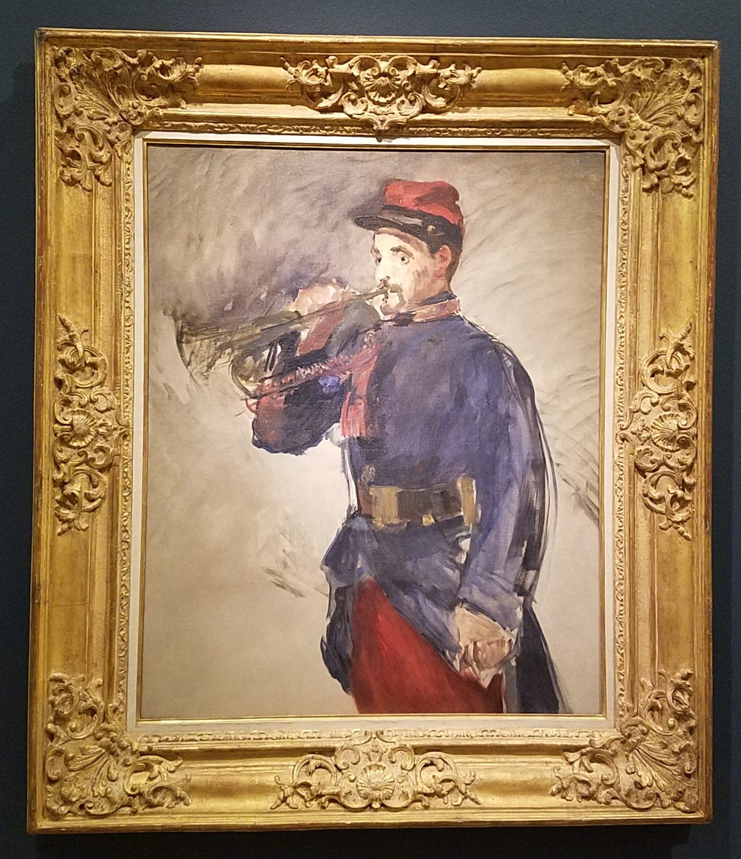 Looking closer at the painting and reading the interpretive panel adds details for art appreciation. This piece is “less finished” than Manet’s other paintings, leading some to guess that painting is actually unfinished. The swift brush strokes have been interpreted to add to a sense of nervous energy and the bugler himself seems to glance hesitantly at the viewer.