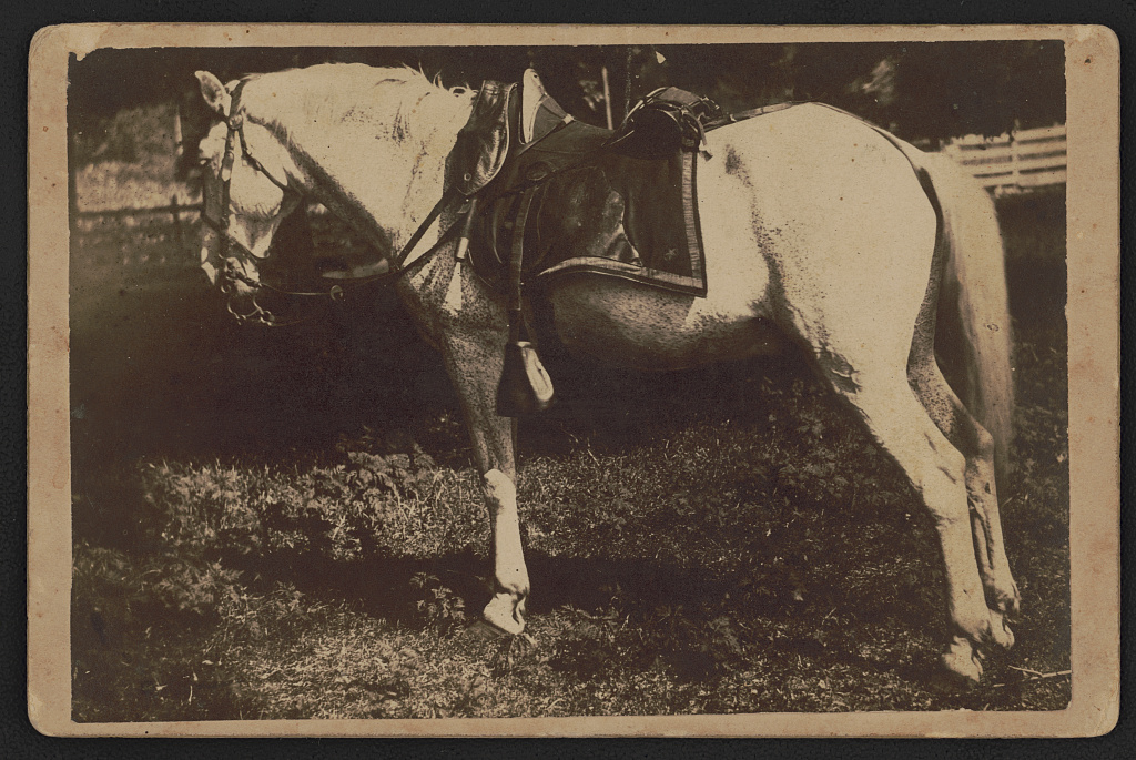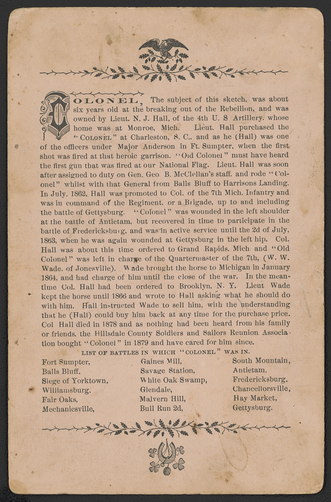 Colonel, the subject of this sketch, was about six years old at the breaking out of the Rebellion, and was owned by Lieut. N.J. Hall, of the 5th U.S. Artillery whose home was at Monroe, Michigan. Lieut. Hall purchased the “Colonel” at Charleston, S.C., and as he (Hall) was one of the officers under Major Anderson in Ft. Sumter, when the first shot was fired at that heroic garrison, “Old Colonel” must have heard the first gun that was fired at our National Flag. Lieut. Hall was soon after assigned to duty on Gen. George B. McClellan’s staff and rode “Colonel whilst with that general from Ball’s Bluff to Harrisons Landing. In July 1862, Hall was promoted to Col. of the 7th Michigan Infantry and was in command of the Regiment, or a Brigade, up to and including the battle of Gettysburg. “Colonel” was wounded in the left shoulder at the battle of Antietam, but recovered in time to participate in the battle of Fredericksburg, and was in active service until the 2d of July, 1863, when he was again wounded at Gettysburg in the left hip. Col. Hall was about this time ordered to Grand Rapids, Michigan, and “Old Colonel” was left in charge of the Quartermaster of the 7th (W.W. Wade of Jonesville). Wade brought the horse to Michigan in January 1864, and had charge of him until the close of the war. In the meantime Col. Hall had been ordered to Brooklyn, N.Y. Lieut. Wade kept the horse until 1866 and wrote to Hall asking what he should do with him. Hall instructed Wade to sell him, with the understanding that he (Hall) could buy him back at any time for the purchase price. Col. Hall died in 1878 and as nothing had been heard from his family or friends, the Hillsdale County Soldiers and Sailors Reunion Association bought “Colonel” in 1879 and have cared for him since.