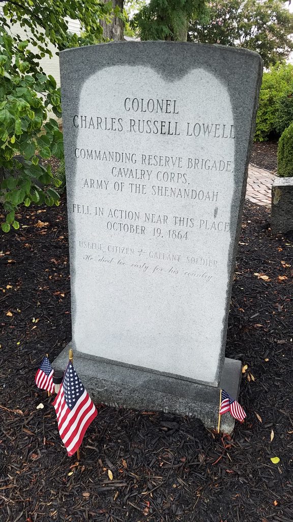Four days after the letter to his wife and two days after the letter to his mother, Colonel Lowell fought at the Battle of Cedar Creek, leading his regiment in a charge toward Middletown as Union troops rallied to reclaim their camps and drive back the Confederates. Dangerously wounded in the chest during an early charge, Lowell insisted on remaining with his regiment and led another attack, galloping forward at the head of his regiment. A second wound threw the colonel from his horse, and he was carried into a nearby home/field hospital. Paralyzed by his second injury, Lowell lingered for hours and bade farewell to his officers who came to see him after the Union victory had been secured on the battlefield. He died quietly on October 20, 1864, only twenty-nine years old.