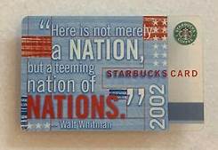 The final installment of the Weekly Whitman is an index of all the poems, newspaper articles, movie-and-TV bits, and everything else I could think of to expand a reader’s ideas about a man who is considered by many to be America’s best poet. I have enjoyed this experience. I thank you for hanging in there when I was in the hospital, which is where the missing dates occur. The illustration I chose for this final offering is one I found a year ago. Whitman never, to my knowledge, wrote about coffee, or I would have used it before. If nothing else shows how pervasive Whitman is in America, surely a Starbucks card with a Whitman quote does the trick.