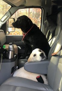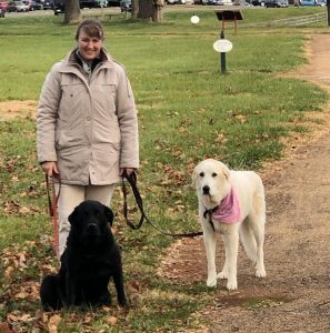 Bosco, a seven-year-old black Labrador Retriever, thinks the world is made for him to explore and enjoy. He can’t get enough of anything, from food to the comfy spot on the couch to all the new sights and smells on a trail. We jokingly call him “the drunken sailor” because of how he wanders haphazardly from side to side of the path, tugging at his leash and anxious to make everything the grandest adventure. Then, there’s Bailey, a seven-year-old Great Pyrenees, who stalks gracefully along and watches the scene with a studious, judgmental air. She’s the one who quickly senses danger and make subtle movements to protect those she loves from potential harm. Shy and quiet, she loves the cold and is one of the most sensitive guard dogs I’ve ever met.