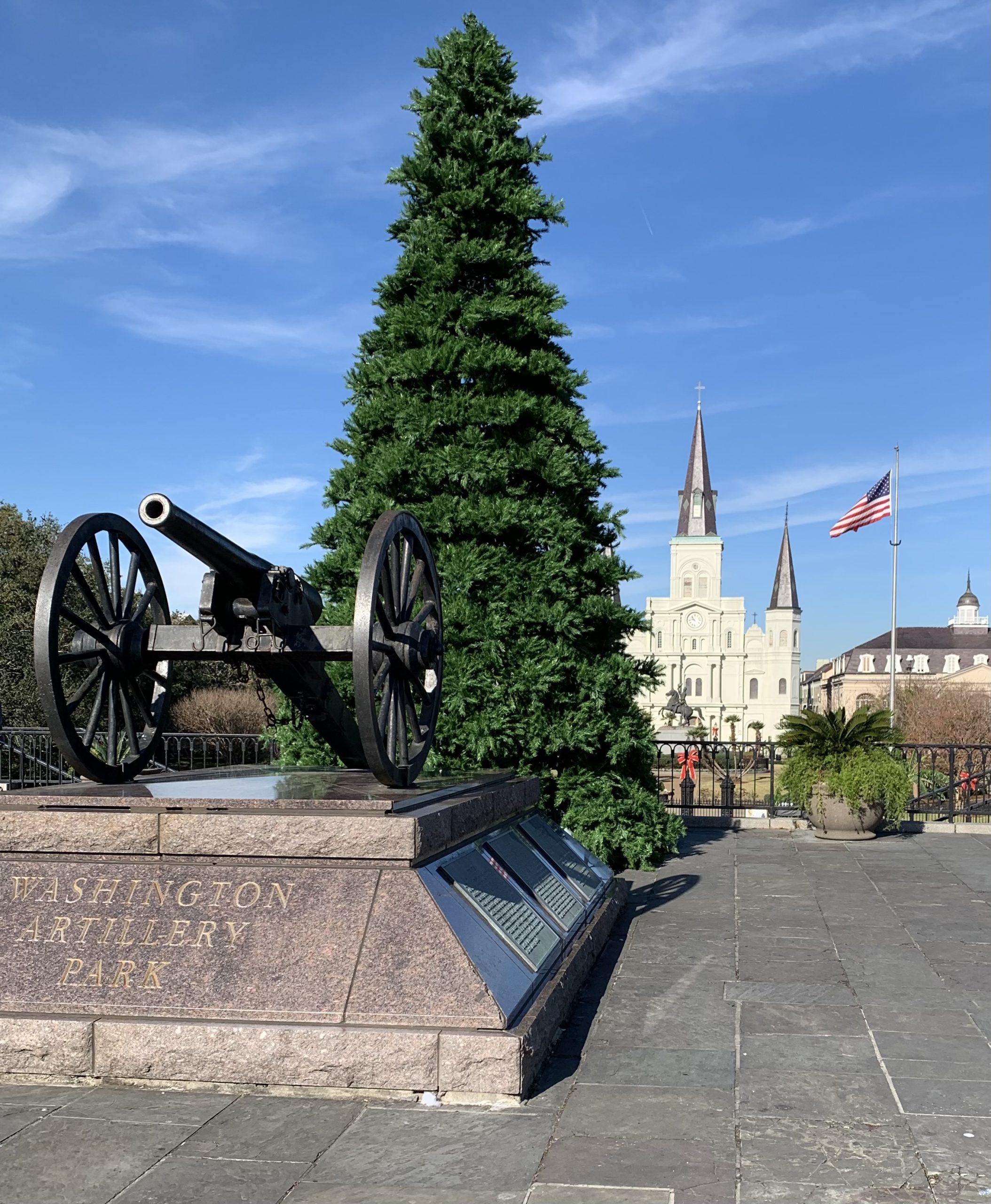 Washington Artillery Park’s numerous placards were installed in 1976, to commemorate the bicentennial of the United States, and were updated in the 1990’s. The signs surrounding the Parrott rifle tell the history of the organization, including its Civil War service. Because of its linkage to a Confederate military unit, the park has recently been identified for possible reclassification by the New Orleans Street Renaming Commission. They have recommended renaming the park for Oscar Dunn, the first African American elected as Louisiana’s lieutenant governor in 1868, though no final action has been taken by the New Orleans City Council as of yet.[i] As a final personal connection, I proposed to my wife Brittany at Washington Artillery Park, overlooking Jackson Square, on Christmas night, 2010, right next to the large Christmas tree erected in the park each year.