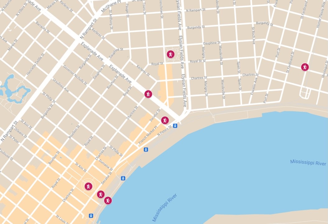 A block down, where Chartres Street meets Esplanade Avenue, we saw a pair of historic signs and stopped. One displays an old map of the local area with red dots. This intersection was the focal point for enslavement within the city, packed with the auction houses that sold enslaved persons, cells and pens that forcibly housed them, and the firms that facilitated this trade. The other sign here explains that Solomon Northup was kept here before being forcibly sold and moved to central Louisiana.