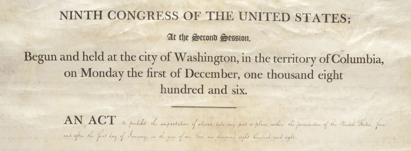 [1] An Act of March 2, 1807, 9th Congress, 2nd Session, 2 STAT 426, to Prohibit the Importation of Slaves; [Online Version, https://www.docsteach.org/documents/document/act-prohibit-importation-slaves]
