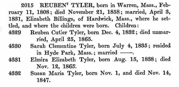 The simple part was to determine if there existed an “R. C. Tyler” of suitable age who ever lived in Hardwick, Massachusetts (a small town 20 miles west of Worcester). Hardwick baptismal records showed a “Reuben Cutler Tyler” as being the only “R. C. Tyler” baptized during that period. Reuben was born Dec. 4, 1832, the son of Reuben and Elizabeth (Billings) Tyler. The family appears on the 1850 census of Hardwick, the father being a farmer of modest means, with Reuben listed as age 17 and a laborer on the farm. The father’s 1859 will lists his son Reuben Cutler as a beneficiary, along with his daughters Sarah Clementine and Eliza Elizabeth.[3] A well-known genealogy of the Tyler family not only gives data on this family, but clearly states that Reuben Cutler died close to the same day as “General R. C. Tyler” did.[4]