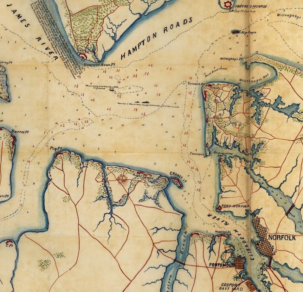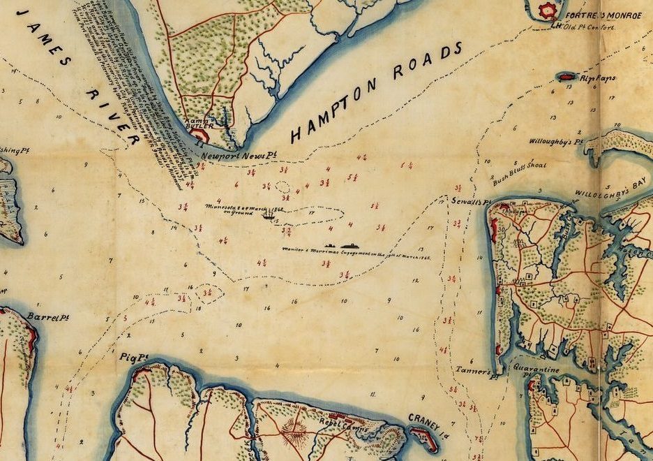 Map depicting Hampton Roads. USS Minnesota’s grounded location is marked, as is the duel between USS Monitor and CSS Virginia. (Library of Congress)