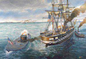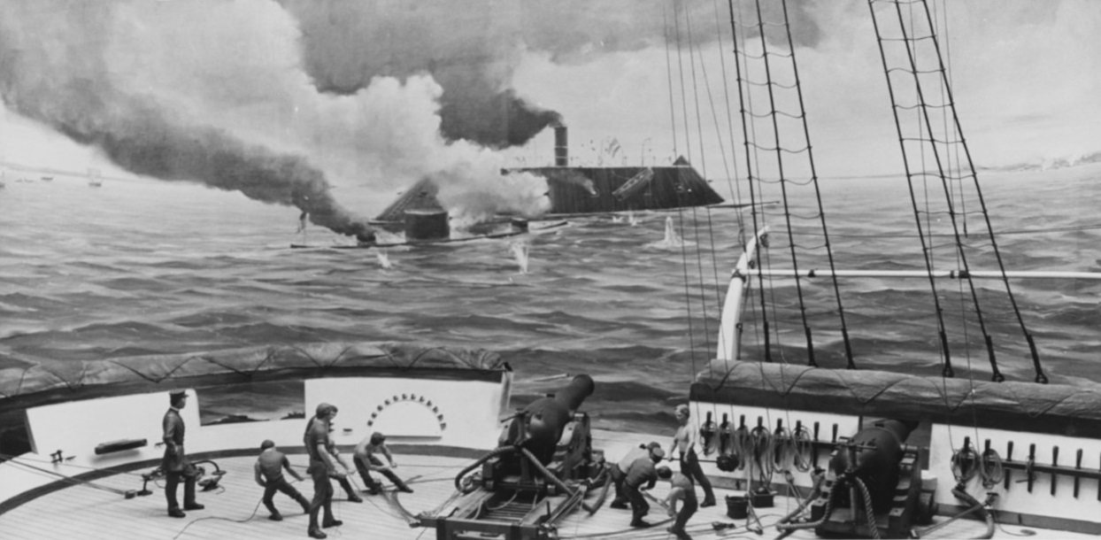 Diorama from U.S. Naval Historical Center depicting the battle of Hampton Roads from the perspective of USS Minnesota. (U.S. Naval History and Heritage Command)