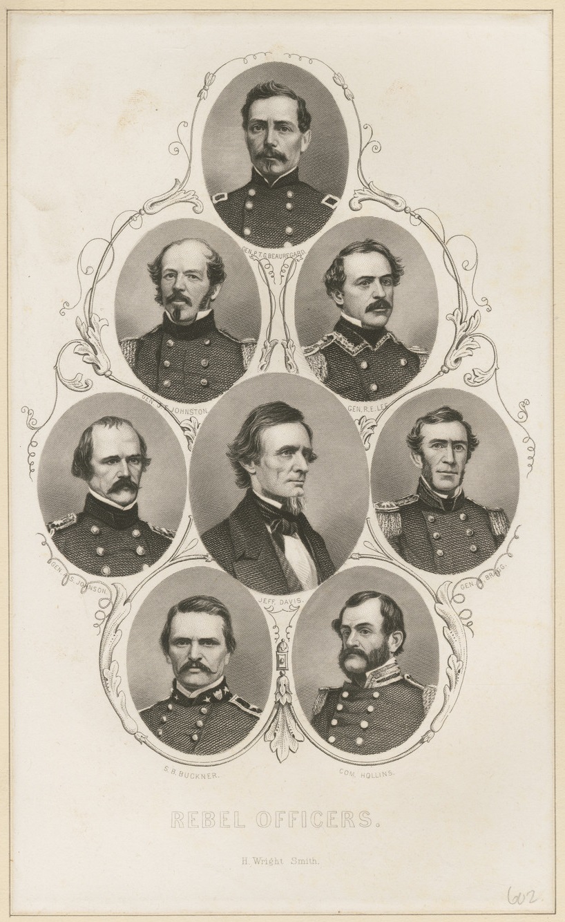 Lithograph of early Confederate leaders, ca 1862. The only navy representative is George Hollins, pictured bottom right, highlighting his early wartime standing. (“Rebel officers”. Lincoln Graphics. Brown Digital Repository. Brown University Library)
