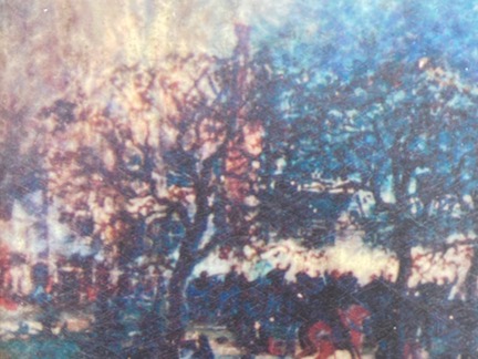 Maxwell looks at the wayside, which features a painting of the burning house, obscured by trees. Conrad Freitag, the painter, was a German immigrant who served in the 84th New York and who was wounded at Spotsy. Freitag no doubt painted the inferno because his regiment was in such close proximity to it. Did he think of the home’s owners? Had he heard the story of the ill-fated breakfast? Had he seen anyone?