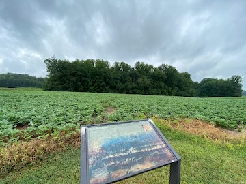 Maxwell and I follow the hiking path across Brock Road and along the ridge that leads to the former site of the Spindle farmhouse. He breaks out into a run now that we’re in an open field and can see where we’re going and we no longer have to worry about the road. The NPS has installed a wayside marker to mark the site. In 2004, an archeological dig found the remains of the house’s chimney, which have since been re-covered to protect them.